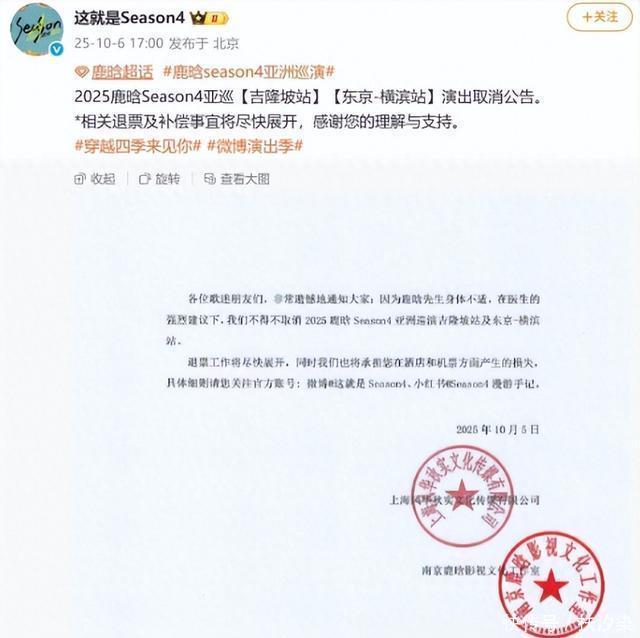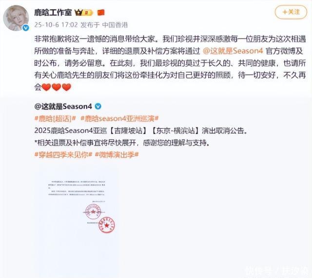 小鹿的人气重回巅峰,可高强度且密集的巡演让他的身体亮起了红灯。 10月6日的突发公告,让粉丝们的心都提到了嗓子眼。 小鹿因身体原因不得不取消后续的两场巡演,可票已经提前卖出去了。